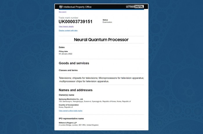 2022 年 1 月 4 日,三星电子在韩国和英国都提交了“神经量子处理器”(Neural Quantum Processor)的商标申请。在其所属的第 9 类别中,包括了电视机 / 电视芯片组、以及电视类设备的微处理器 / 多处理器芯片。虽然申请文档未披露更多细节,但我们不难猜测该公司会为旗下智能电视产品线引入新颖的 AI / 神经量子处理器。